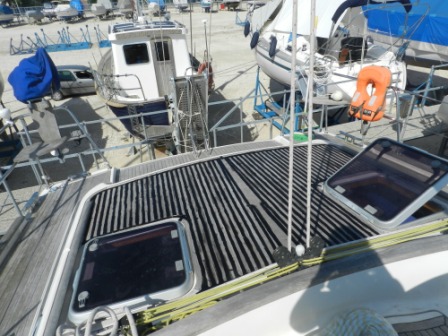 We had had problems with parts of the teak decks where some of the rubber strips had deteriorated (old age) and become sticky so needed replacing. We spent a while ourselves digging out the old rubber with special tools Nigel had brought from the UK, but it was soon clear we needed the help of the very efficient professionals. What a relief to hand that job over! Here it is filled and curing before cleaning up..we hope it produce a great result!