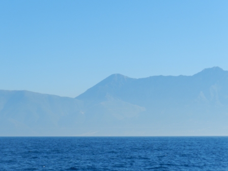The wind freshened up to 20-25 knots so we reverted to white sails, and continued to make excellent speed until the going down of the sun killed the wind. Unfortunately the quartering sea did not calm and the night trip, under motor was exceeding ly uncomfortable. It was an exciting night of dodging ferries and cruise liners going through the narrow passage between Albania and Italy. Like bats they all travel at night so we were kept busy and were grateful for our radar and AIS!