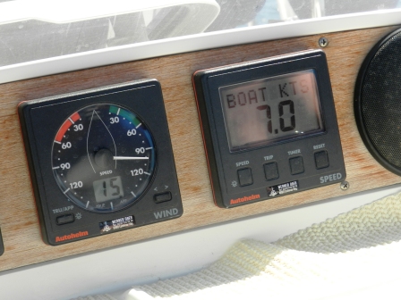 We did not have to wait long for enough wind just aft of the beam  to fly the cruising chute again. We set the compass course to South and made great distance averaging a very good 7 knots.