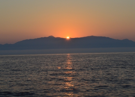 We found the North Westerly wind in the early hours under a full moon on Mo’s watch, so sails up again and then Mo was entertained by the dolphins once again. It was quite eerie with them leaping about at night! Later at 0545 came a brilliant sunrise over the Montenegrin coast.