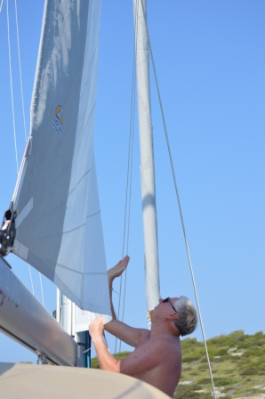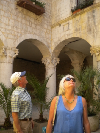 Sharron and Peter only had one week and the lack of wind was bit of a barrier to long distance sailing. We put into Murter for a replacement battery charger to be fitted and spent two windless days on Zirje during which time we swam a lot, did some mainsail maintenance which involved srewing up the full length sail battens that had unusually come undone, explored ashore and enjoyed a long lunch at the Konoba in Stupiva Bay. We had promised Peter and Sharron a trip to Vis, some 40 miles further south, to visit some excellent wineries and cool bars there. It eluded us once again when it became clear the lack of wind would be swiftly followed by a Bura, a strong northeasterly that would have made our return trip very uncomfortable. Instead of Vis we headed to Trogir for sightseeing, retail therapy and some good meals!