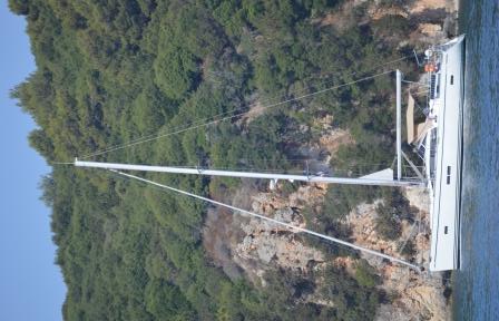 We wanted to make our trip from Corfu to Lefkas last as long as possible as we were on countdown for going home and our last week was looking settled. We spent a couple of hot, windless days anchored off Petriti on the south coast of Corfu and with the promise of wind we set off towards Lefkas planning to stop over at one of the bays on the mainland coast. We fetched up in Two Rock Bay quite late in the day and the pretty bay was quite busy with anchored boats. A catamaran obligingly decided to leave creating a useful space for us to drop our anchor. The hard sand was not the best of holding but we had a calm night ahead. We spent most of the next morning exploring the bay in the dinghy to discover a nice beach, interesting rock formations and a surprisingly small sandy anchorage area. In line with the rocks that gave the bay its name was a seriously rocky bottom not at all suitable for an anchor, and we were rather shocked to see a charter boat drop in that area. Wonder if they ever got away!