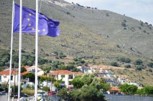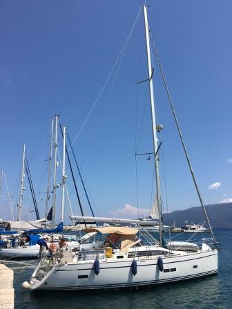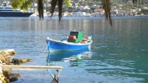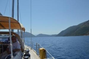 In light winds we sailed south to round the bottom of Ithaca, heading west to Efimia on Kefalonia. As we crossed the narrow channel between these two islands we met a Force 7 bursting down from the north which went cyclonic as we approached the coast of Kefalonia. A fast burst of sailing peaking at 8.5knots with a beam wind to start with but as it got cyclonic, it was sails away and a motor into the harbour. We moored up in the teeth of the strong afternoon wind with the very able help of the obliging harbour master. We had 60m of chain to hold us off the quay and were quite glad of it as all afternoon as we rode out the relentless gusty wind screaming over the hills. This area is famous for these wind effects.