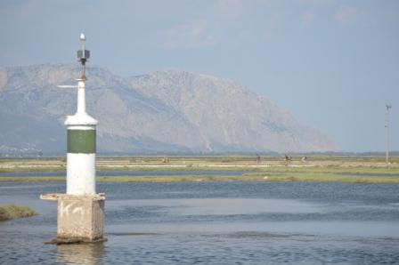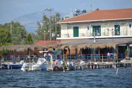 The channel to Mesolongi is very pretty with local fishermen’s houses on stilts in the shallow marshes. Paths and roads link them to the shore and it was surreal to see cyclists just across the water, quite close to where we were motoring. A convenient overnight stay here with plenty of company from the local mosquito population.