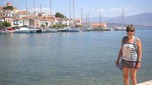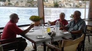 By midnight the wind abated and we fell into a welcome sleep only to be horribly disturbed by a local bar playing loud heavy music until 6am. Nigel was ready to commit murder but we were reminded that this is Greece! Sunday dawned bright so we washed down the boat as there was still plenty of red dust about, but the skies blackened over and we caught a heavy thunderstorm late afternoon. We enjoyed a long leisurely lunch in a very Greek tavern across the bay with another English couple we have met along the way. Tony and Ann Montgomery Smith, fellow Cruising Association members, on catamaran Razzmatazz, were delightful company.