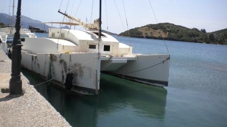 The wind arrived as soon as we cleared the bridge and had put the camera away and the decision to carry the jib only was a good one as 20knots behind us became 25 and more. Needless to say it was a fast sail to the island of Trizonia still off the north coast, and we were quite glad to arrive even though 30knots was promising a difficult mooring situation. Other yacht crews came to assist and we were soon moored alongside in a totally derelict half built marina.