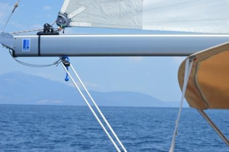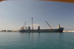We had enjoyed a broad reach from Galaxidi to Kiato, a town with a little used commercial harbour and small fishing harbour, where we expected to be mooring alongside on the commercial dock. As we approached we realised a change of plan would be needed. Taking up all the dock was a large cargo ship, with cranes and lorries on the dock busy unloading what seemed to be a very dusty cargo. Not an option to go anywhere near this operation and our brief excursion into the fishing harbour convinced us that we would not find a suitably deep place to stop here either.