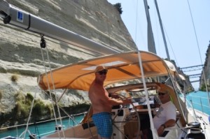 It was 5pm and the wind was abating, so we decided to make a further two hours and try to berth up in Corinth harbour, which did offer the option of anchoring as a fall back option. Within an hour we were motoring into a strong headwind as a local north easterly whipped up a lively sea in the cul de sac of the eastern end of the Gulf. Apparently this is quite the norm, so we found out later. The harbour at Corinth offered a commercial dock and a small yacht harbour, but it was all open to the northeast and the very shallow approach to the yacht harbour was untenable, as was the anchorage! No ships here, so a quick call to the Port Authority gave us permission to go onto the commercial dock. This turned out to be not so easy but we managed to find a space between the huge rubber fenders where the boat could come alongside sufficiently close for Mo to leap off with the warps! The wind did not help, but a charming Greek fisherman minding his own business did help haul in the ropes and get us tied up. It was a very bumpy night. First thing for us in the windless morning we made our way into the tiny yacht harbour where the only space we had identified the previous evening had been taken by a yacht that had come in stealthily in the calm of the early hours before we woke up! Fortunately some friendly Norwegians on a large 54 ft yacht allowed us to go alongside and this is where Brian and Michele arrived late afternoon on Tuesday 12th June.