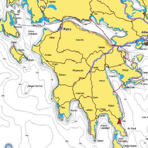 It is time for a chart of the Peleponnese to help you see where we have been and where we are going, clockwise round! Our track is shown through the Gulf of Corinth, along the top, east of Kefalonia, through the Corinth canal at the eastern end. Our final destination is Kalamata at the top of bay between the two western fingers of the Peleponnese, but at this point we are in Monemvasia, shown by the red arrow.
