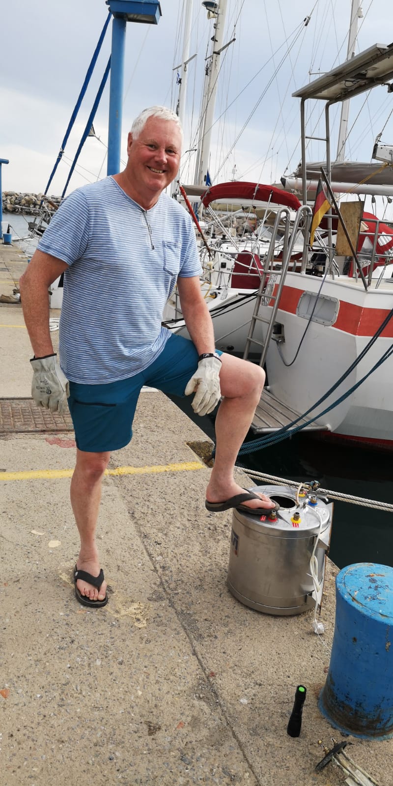 Peter arrived late afternoon on Sunday 12th May bearing vital gifts to repair the boat!