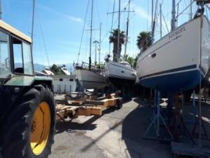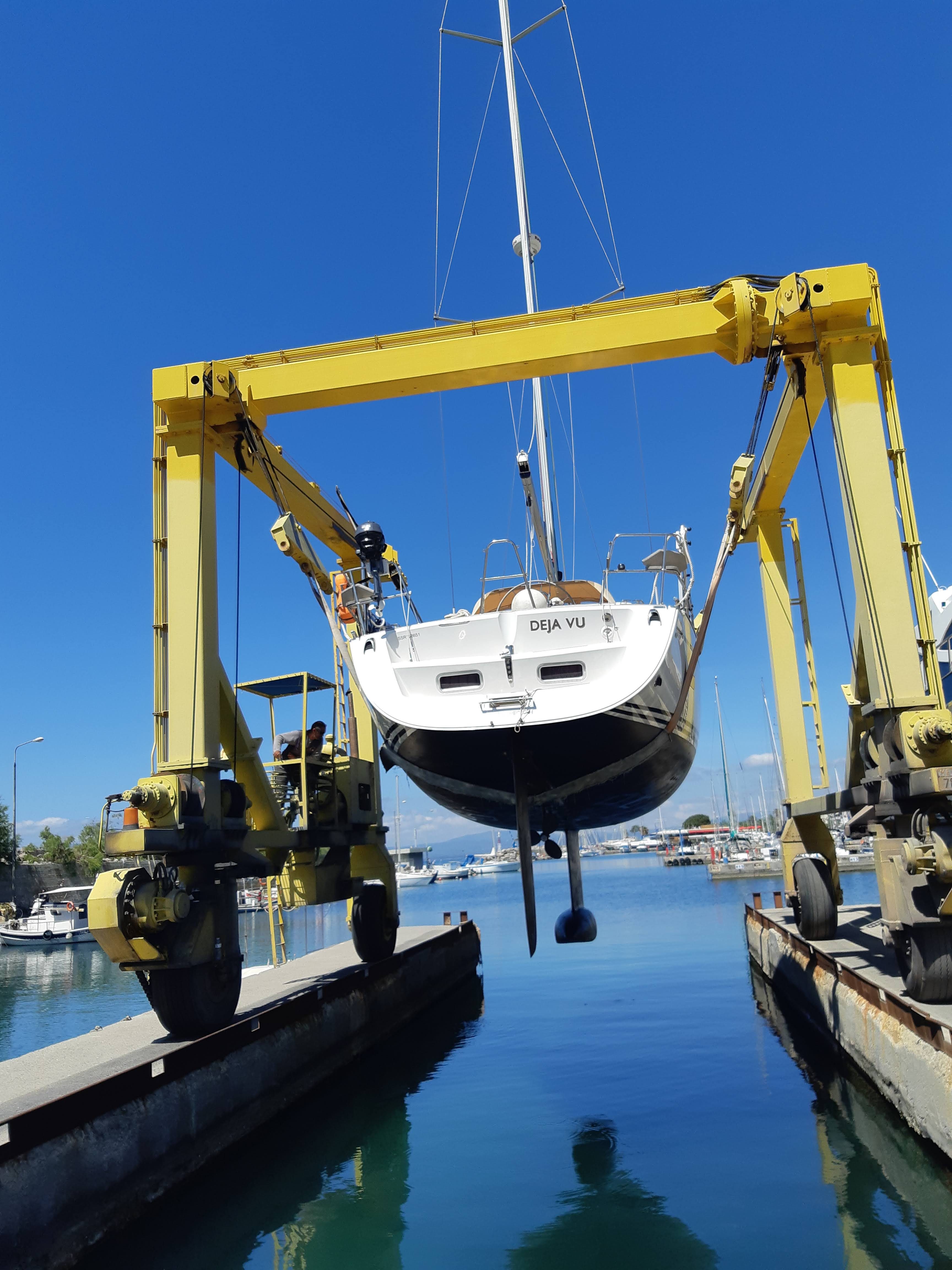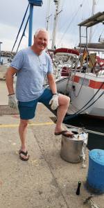 We arrived to find the boat in a sorry state after two weeks of heavy rain that dumped half of the Sahara desert onto our decks and cover. Our first job was to hose the boat down which was an immediate improvement but the red dust had penetrated everything and it took several washes to rid Deja Vu of all the dirt. Next came the antifouling which was the usual messy task of rubbing down, masking and painting. With that finished we booked our launch for Thursday 9th May.
