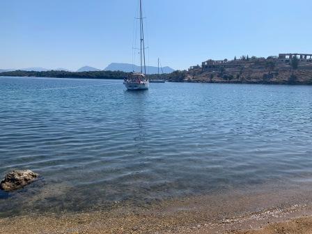 We had a wonderful time with them, visiting Little Vathi on Meganissey, longlining in Abelike Bay, messing about in the dinghy, anchoring off Ligia and Meganissey, tying up on Stavros’ pontoon in Sivota and sailing back to Lefkas Marina getting moored up just before a storm came over. Good timing!