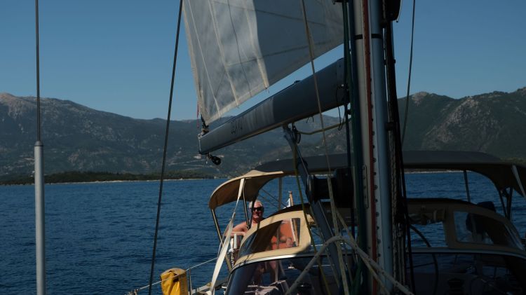Jib on, water filled, shopping stowed, decks clean, we were finally ready for the off. We left Cleopatra Marina soon after 10am on Saturday 29th August. We aimed to catch the 12 noon bridge opening at the north end of the Lefkas canal, so with plenty of time to spare to cover the six miles south, we played around with the sails, more to reacclimatise ourselves with ‘the ropes’ than anything else.