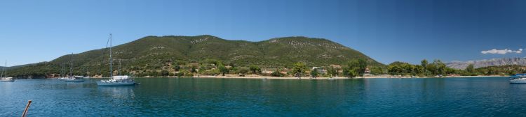 Repairs done, fresh bread bought, we sailed across the north coast of Meganissi to Port Atheni. This is a sheltered inlet and usually quite quiet. We had to be creative with our choice of anchorage but we did well and fitted in safely with the other several boats just before the excitement of the afternoon sea breeze. The high temperatures we are getting, well over 30degrees, seem to intensify the sea breeze, so it is always exciting and a good test for the anchor hold. Mr. Manson did well again.