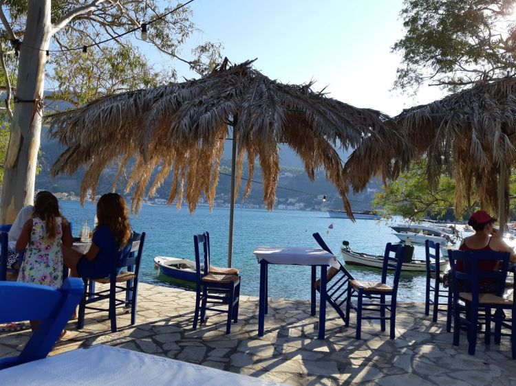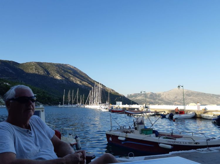 I am beginning to think that we are finding it quite difficult at times to just ‘hang around’ or ‘ chill out’. This trip we have no passage making to do, which has, hitherto always provided focus and purpose. We are simple loafing around the North Ionian Sea, and pleasant, no, wonderful, though that is, we are a little fidgety from time to time. We were ready to leave Sivota and, in a windless sea, we motored across to Kalamos, dropping anchor in the abandoned bay of Port Leone. I say, abandoned; it used to be an inhabited port for the island, but is now left for passing yachts to spend some still time. We swam and lunched, then sailed north to Port Kalamos. Here the inimitable unofficial harbourmaster, George, guided us into our berth and reminded us of his welcoming restaurant in the corner of the harbour! There is a steep mountainside falling down to the harbour, so after the afternoon breeze come hefty katabatic winds that blow until 11 or 12pm.
