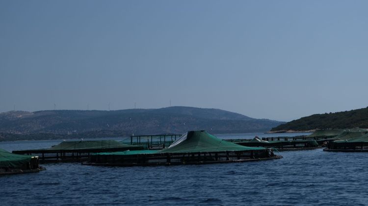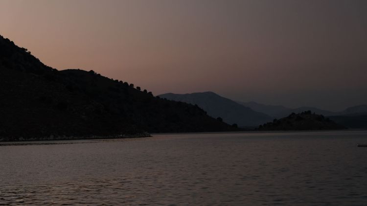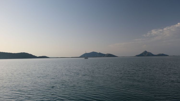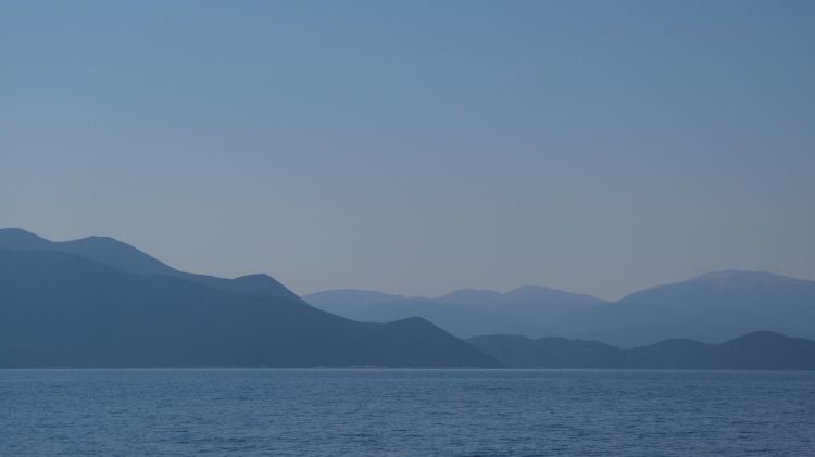 Mo chose the next destination to be Liminis Petalis, a large empty inland anchorage behind a tall rocky range on the mainland coast south of Astracos, providing shelter from the prevailing winds. It is close to an industry of seemingly uninhabited fish farms, but otherwise it is quiet and remote.