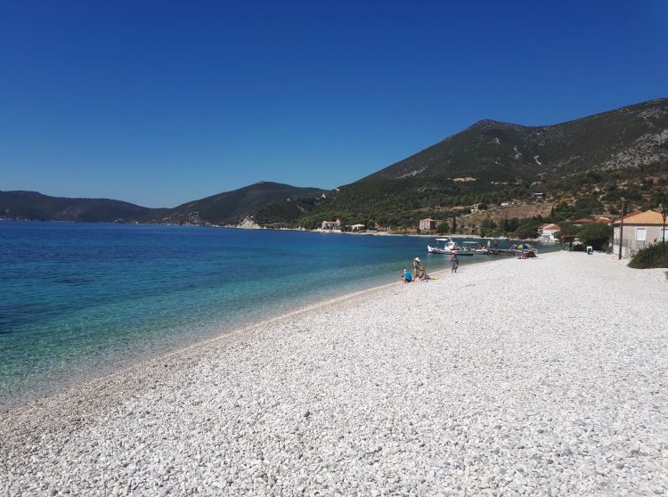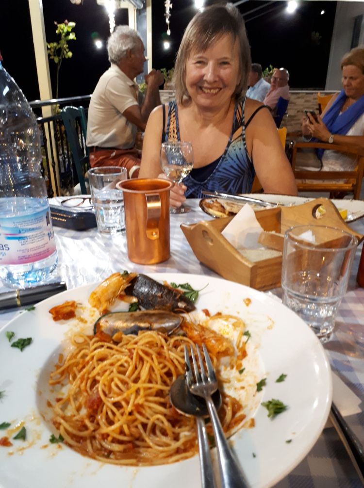 We anchored off the adjacent beach for remedial swimming before heading just a few miles along the bay to the small town of Eufemia where we will get power, water and a chandlery. Nigel is anxious about our starter battery and so am I! We procured a set of jump leads for that ‘just in case’ time. Next stop Big Vathi on Ithaca with a couple of glorious days anchored in local bays off the east coast of Ithaca. Clear blue sea, sandy bays, rocky sides and snorkelling opportunities.