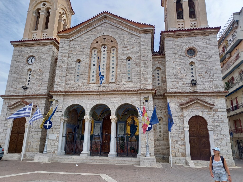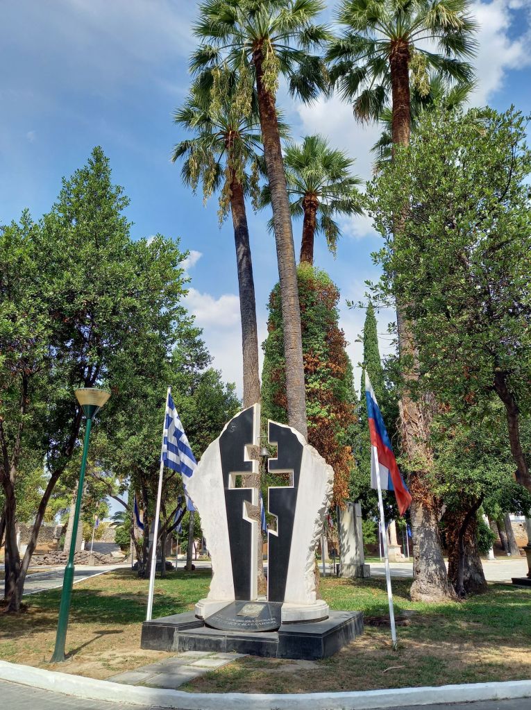 We took a bike ride into the town and enjoyed a coffee in the Square, Nigel had a haircut at a local barber and we visited the Garden of Heroes. We saw some interesting churches and a mixture of architectural styles with the old being replaced by the new in most places. The garden of Heroes was particularly peaceful and reflective with dozens of statues scattered amid tall trees with country flags flying, presumably to acknowledge the ‘heroes’ connections. Unfortunately there was not a word of English anywhere, so we had to be content with the visual and only imagine the information! We searched for Byron, who actually died in this place, but we are not sure if he was represented there.