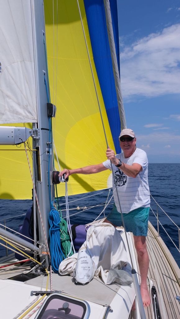 Messolonghi Marina was next at the gateway to the Gulf of Corinth and, en route, Nigel was pleased to dust off the cruising chute and get it hoisted for several miles before a squall threatened. It was at this point that Mo confessed to having overshot the course and we had to turn and beat back a couple of miles. At least Peter and Irene had a complete sailing experience that day. However Peter was getting increasingly unwell and it was only after we had made the trip under the Rion bridge to the island of Trizonia, that the light dawned and we asked him to do a Covid test. His health was giving us serious cause for concern. All of our visitors bring good cheer and good company. Peter and Irene also had a different sort of gift, the very unwelcome sort. Covid had arrived, Peter was certainly afflicted and Nigel caught it from him.