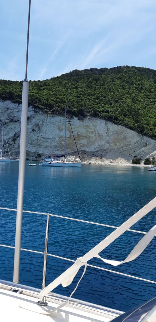 First stop was a favourite, Varko Bay, for a lunchtime swim and lunch, then a sail down to Sivota for a fun night there. Our plan had always been to head into the Gulf of Corinth with them and deposit them in Galaxhidi, from where they had made plans to stay in Athens and then tour parts of the Peleponnese before returning to the UK and then their home in Portugal. They were round the world (well nearly) sailors so well accustomed to boat life and the heat, no problems there! We started to head west from Lefkas, stopping over, long-lining to the rocks in One House Bay on the island of Astokos for a welcome midday swim and lunch before sailing on to the quiet anchorage on the mainland at Limini Petalis for a meal on board.
