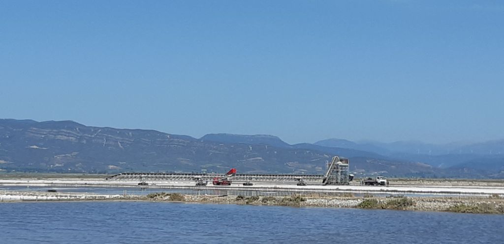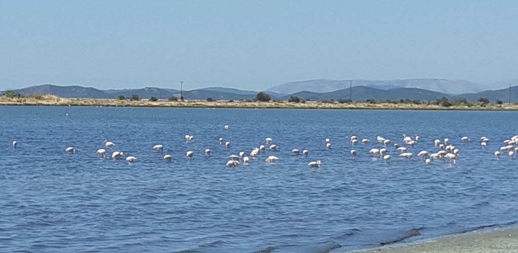 The business concluded we decided to take the causeway parallel to the canal we had transited to get to the Marina at Messalonghi. It was a fascinating 4km drive and we were rewarded with magnificent views across the salt flats, sightings of many flamingoes busy feeding, pelicans in the distance, egrets and many other seabirds, not to mention the oddity of cars parked on narrow tracks branching off the causeway at various intervals.