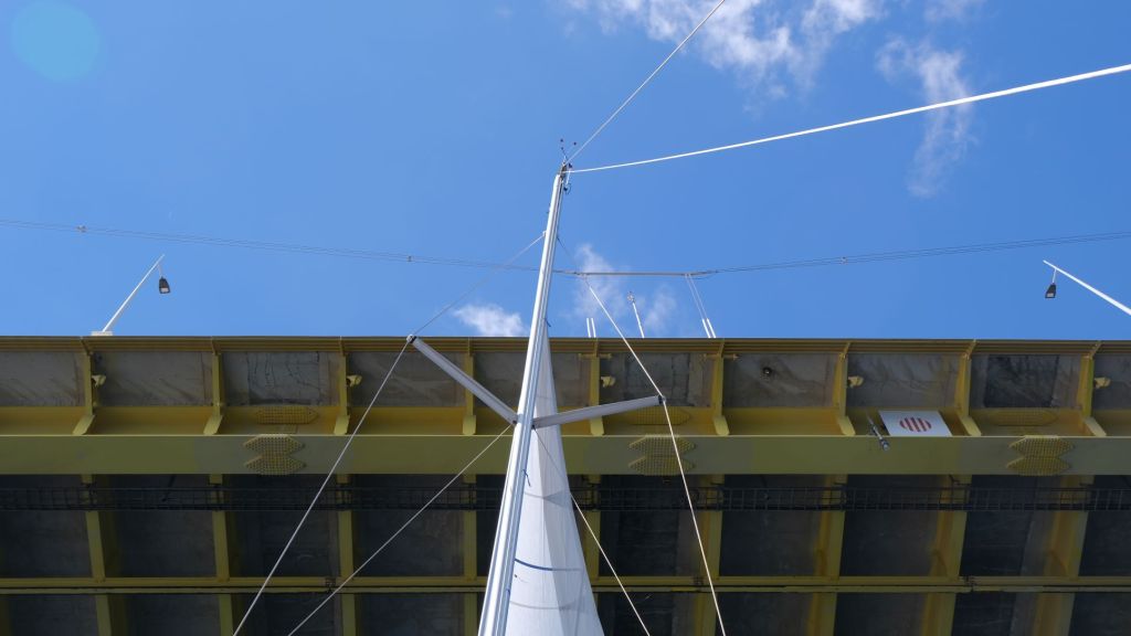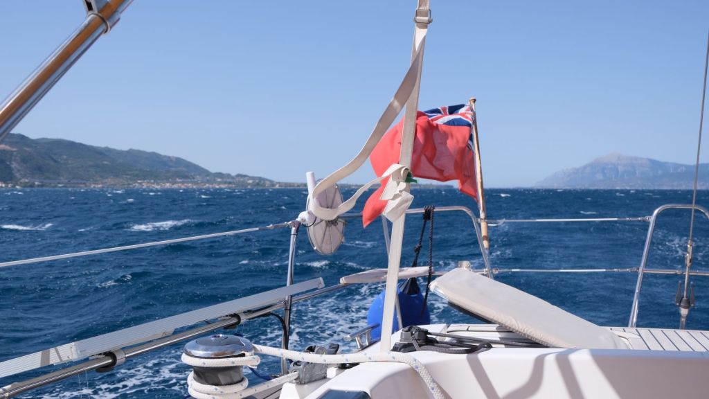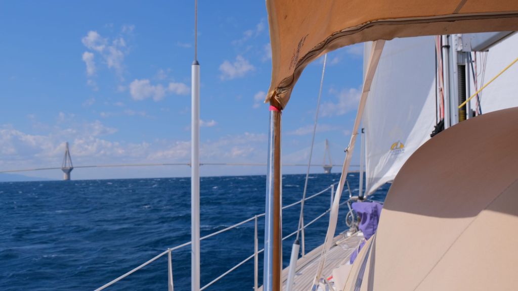 Time to move on, we had a westerly wind forecast, so we slipped lines at 730am on Friday 16th September to head further into the Gulf of Corinth. An uneventful motor to the Rion Bridge was followed by a moderate goose wing sail. It soon became clear we needed to lose the main as the winds were increasing from the Force 4 forecast. Before long we had 25 knots over the stern and soon after that became 30knots. With just the jib, reefed as the wind increased, the boat was surfing down the waves at 9 knots. Nigel did see 10kt on the log very briefly.