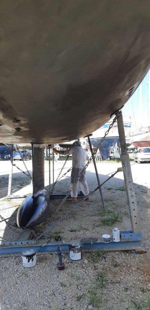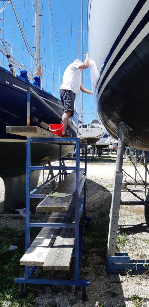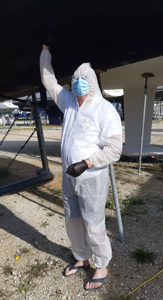 It was a joy when the second day dawned dry with some sunshine so that we could prepare surfaces for anti-fouling and wash the dusty decks. Even though we were well clad with protective clothing, it still was not possible to escape rings of toxic black dust around goggles and masks. Much showering was required afterwards. Then anti-fouling, then hull polishing making use of the 3 level staging provided for the task.