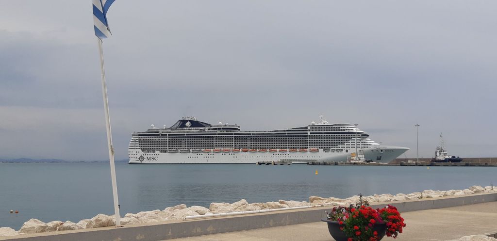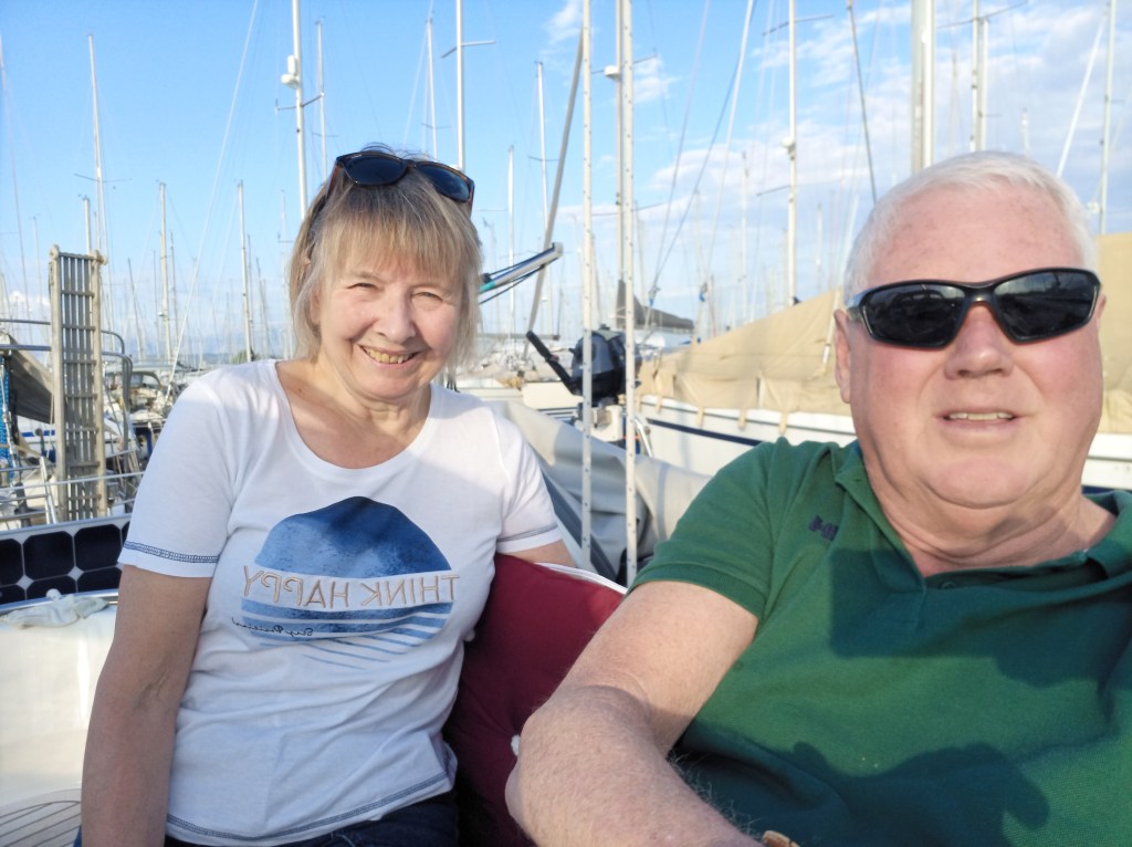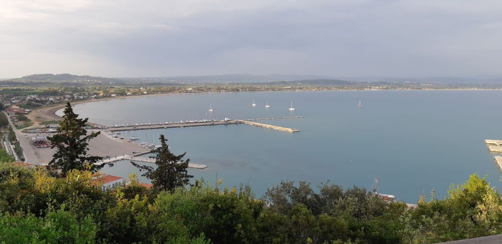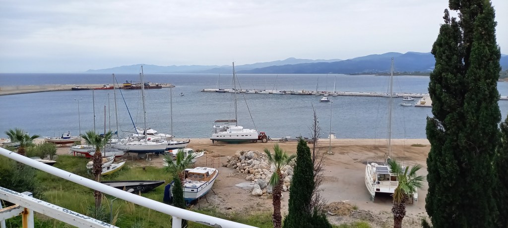 On the move again the next day, feeling somewhat jaded when greeted again with 22 knot winds in the harbour. Lifejackets on, we were prepared and set off with a reef in each sail. It didn’t last long and we were becalmed after an hour and had to motor across to Katakolon for our overnight stop on the north coast of the Peloponnese. It was a gloomy and cold day with poor visibility. Katakolon is famously the gateway to Olympia, as this port accommodates huge ocean liners disgorging thousands into the tiny pop up settlement that exists only to serve the tourists. At night when the ships are gone, it takes on the form of a ghost town. Having said that we made the climb up the hill to a bar that had a sublime view out across the harbour into the bay. It was worth the effort. We were moored near another British couple who now live in Weymouth, but had spent many years living in Farnham, Ann from Broomleaf Road and Paul from Crondall Lane! We had a vague sense of Déjà vu about having met them before but couldn’t put a finger on it. We did establish we had mutual friends and acquaintances; always a small world.