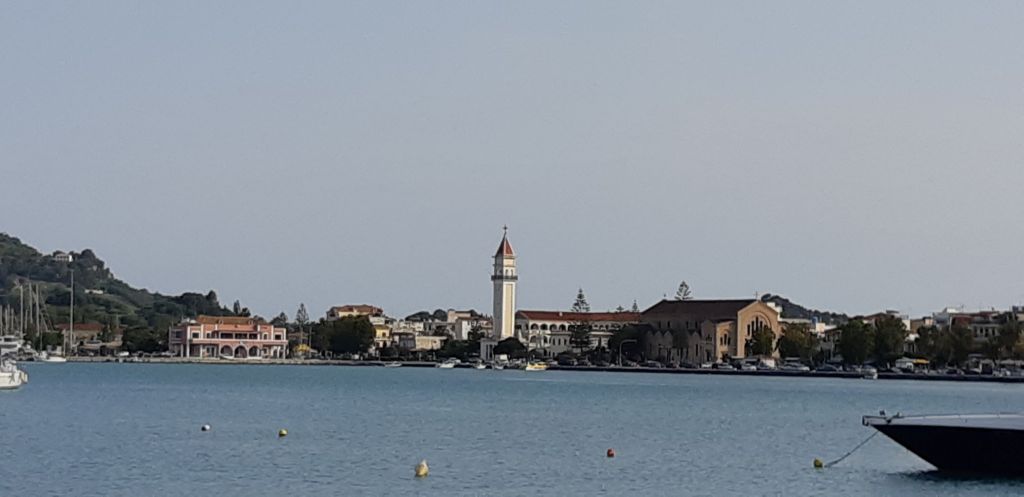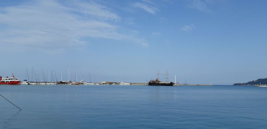 With our intention to get to Athens by the end of May we could not linger and so travelled south to Kefalonia, an overnight stop in Efemia and then on another 30 miles to Zakinthos. Great beam winds but an ugly sea greeted us off the bottom of Kefalonia which made for an uncomfortable ride to Port Zakinthos three quarters of the way down the island on the East facing coast. Uncomfortable although it was the journey was quick with the boat surfing along at over 8 knots for nearly three hours. Hooray for us, it was a new port of entry. We tied up stern to on the north east harbour wall, ably assisted by the local wide gang who gave us forms and took our money. It all seemed to work out well after Nigel had renegotiated the harbour fees to a more sensible level!