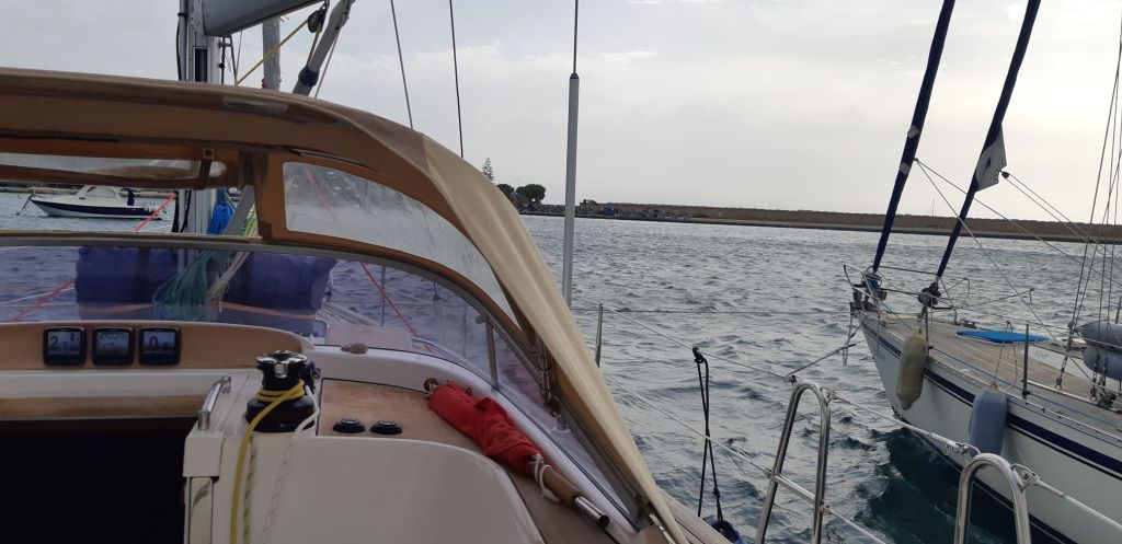 The wind strengthened from 3pm with the forecast 25knots. Anchored out and lying back against the quay, our anchor jumped as the wind exceeded 30knots causing our boat to drop back onto the quay, protected, thankfully by a raft of fenders we had deployed for that eventuality. Fortunately our anchor retook as we hauled it in, so we only lost 10 metres of chain from the 60 metres we had laid. 30knots became 35 knots and the committee decision of the 4 boats in the same position as us was to link them with a line to the quay to take some pressure off all the anchors. This together with keeping engines on and motoring forward kept us in the battle with the wind. The core wind was about 35knots but there were frequent gusts of 45knots and around midnight, it topped 50-55knots, almost certainly due to the topography of the backdrop of mountains. Unrelenting, the forces of nature were totally humbling and quite terrifying. We took it in shifts to take watch and get eye closure; sleep was a long way off. Finally at 3am the massive winds abated and we fell into a fitful sleep.