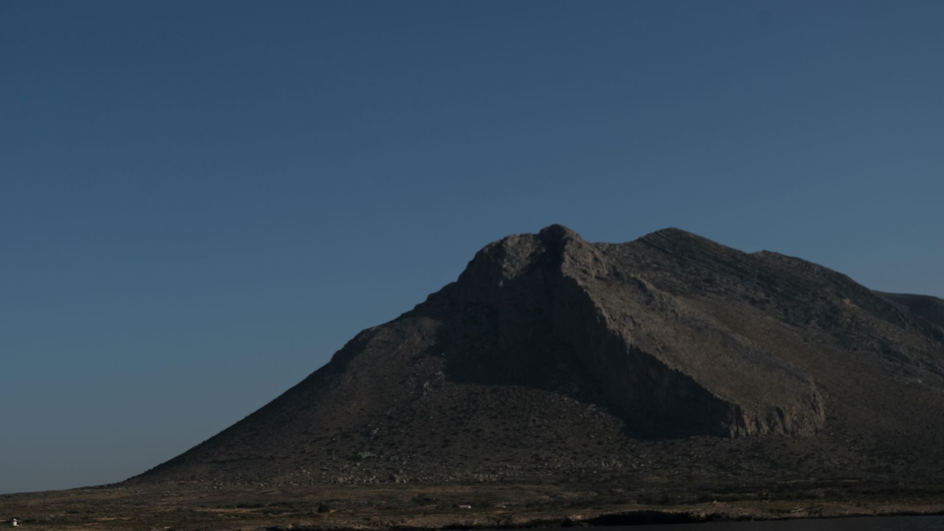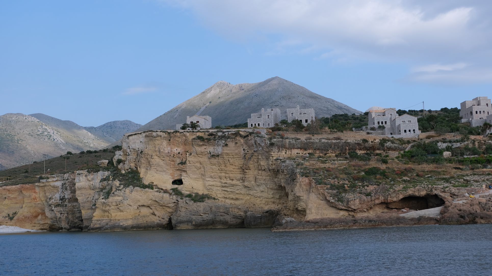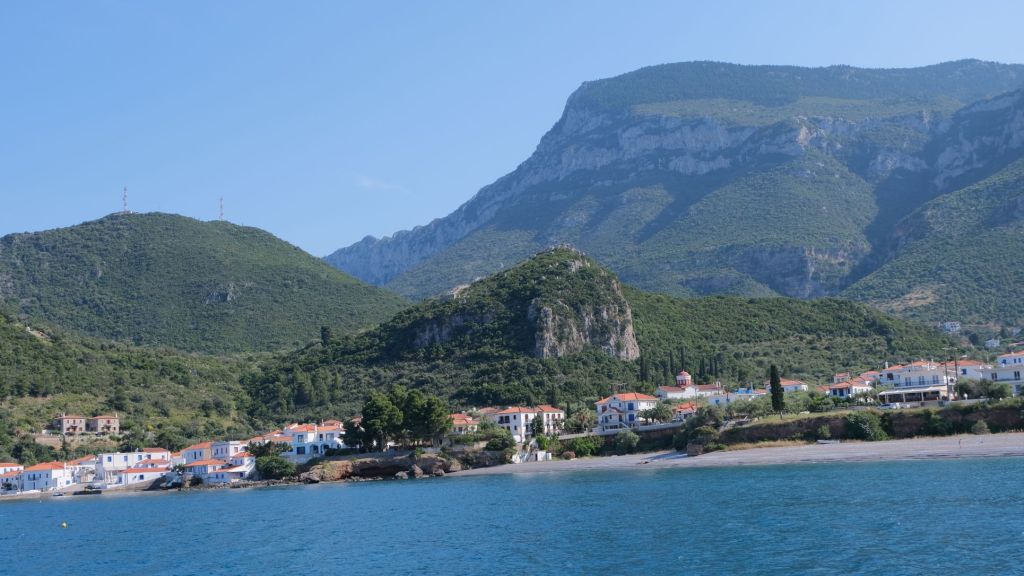 We stopped overnight in Mezapos on the western end of the Mani Peninsular. This proved to be a surprisingly good anchorage with the boat held firm in strong offshore winds. We did not venture ashore but there is reported to be a tavern and a smart hotel. We then travelled around Capo Grosso, a huge lump of rock and the tip of Mani in the cool, early morning calm and sailed 20 miles east into the southern bay of the island of Elafonisos. This was a pleasant stop in crystal clear blue water off the sandy beach. Good holding despite the swells that continued through the afternoon but as the wind died in the evening a peaceful night.