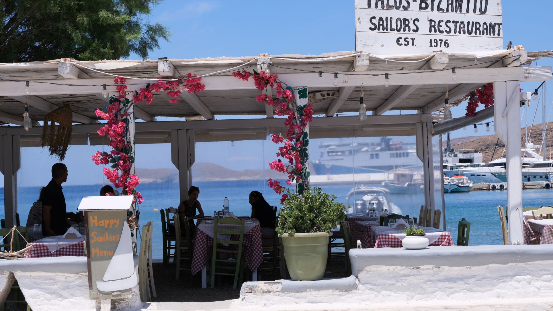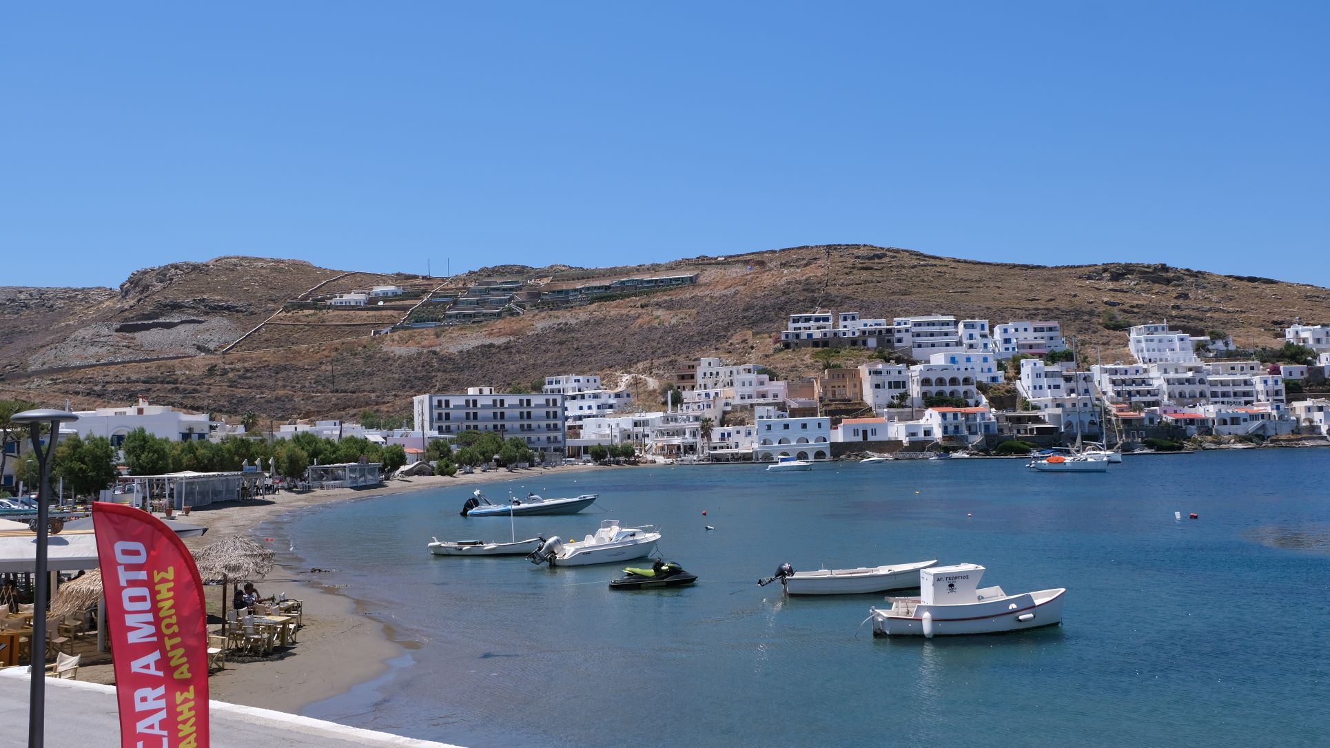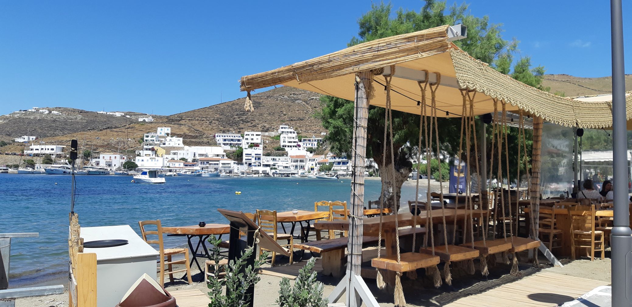 Our next stop was Merikhas, the main town on Kythnos. It turned out to be a delightful place with plenty of mooring space for yachts with excellent amenities. The typically island Greece town sported many restaurants and one of the highlights of our visit was eating sardines and drinking Rose wine on the beach in one of them. Another great advantage of the place was its shelter from the persistent strong northeast wind, a blessing after being blown around in Apokriosis bay. Few shots of Merikhas below.