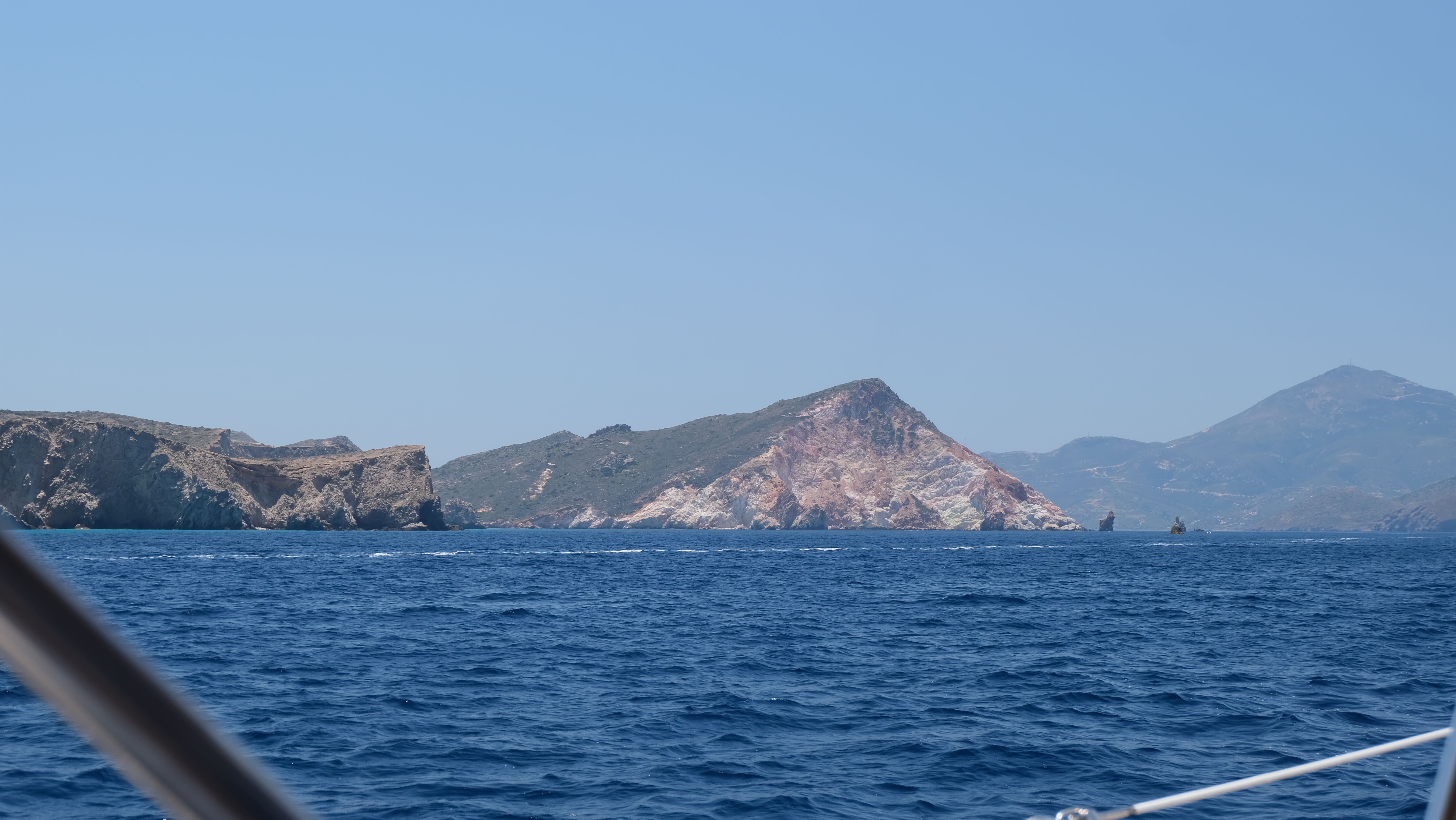 We were sad to say goodbye to our crew, but Chris and Liz had a plane to catch, and we had a weather window to do the 70 mile trip across from Milos to the Peloponnese, which we completed in 13 hours on June 8th, sailing for half of it, motoring when we lost the wind or it chose to blow the wrong way! Before we left we re-provisioned the boat at the local supermarket. It was a ghastly experience, the store was tiny and stuffed with people fighting over the last items of particular foods; the butcher, the only one in town, decided to fulfil a huge order for mincemeat at peak time so the queue grew and grew as she failed to serve anyone. If ever a town needed a better shop it is Adhamas!