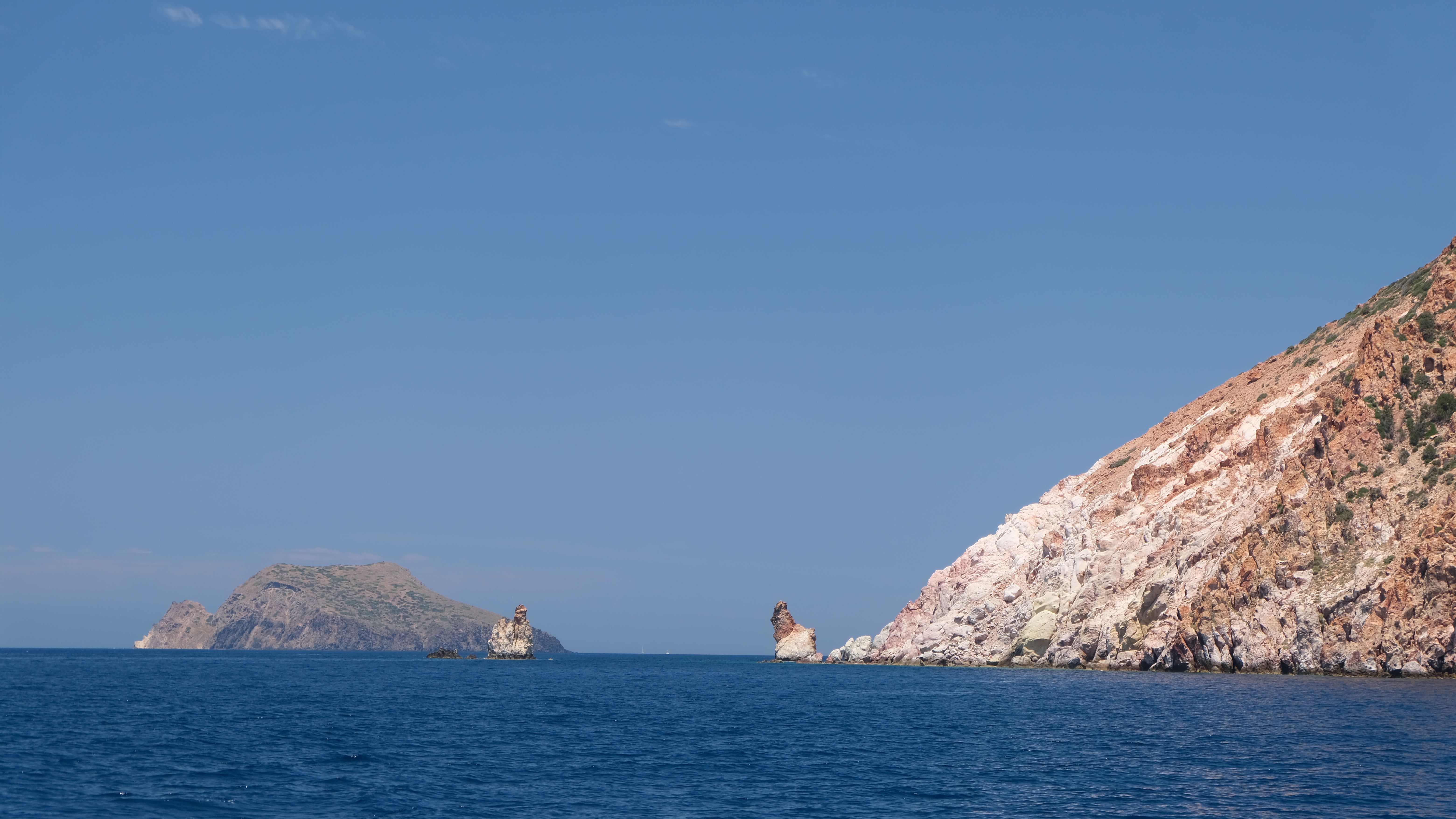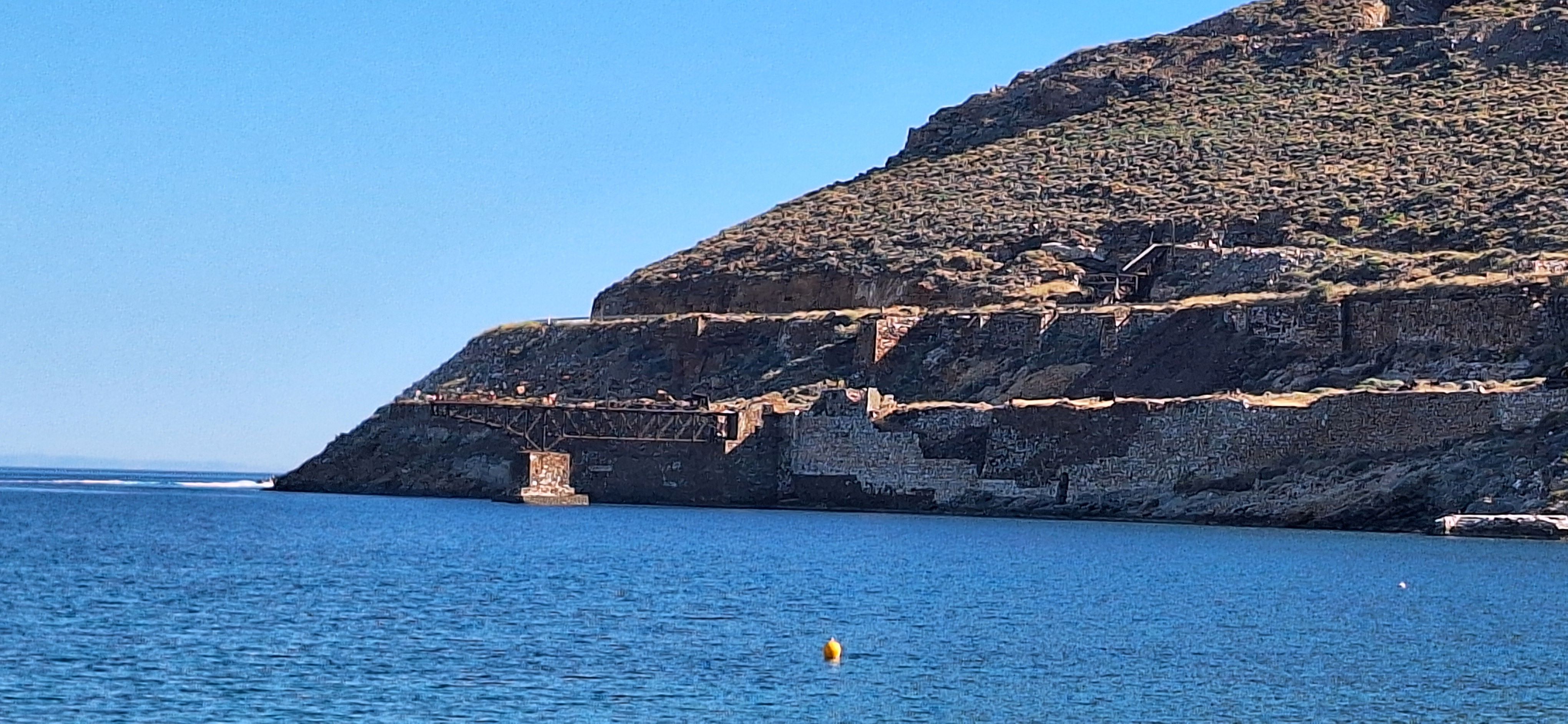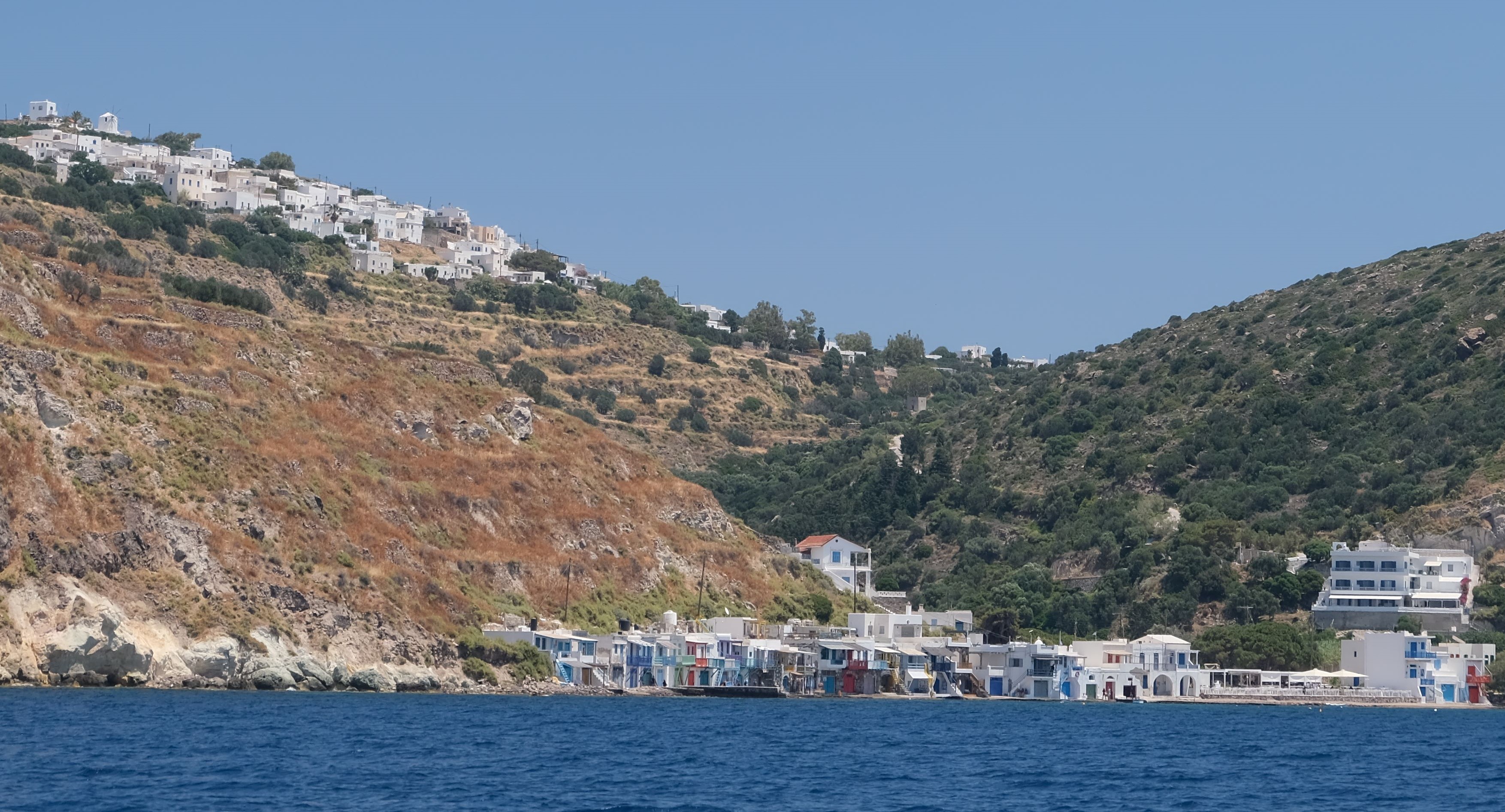 Milos is an ancient volcano which long ago erupted and scooped out a giant bay. The circular mountain ridge surrounding the bay is mostly barren but shows scars of open cast mining of alum, sulphur, barium and kaolin. In past times the large sheltered bay gave Milos a unique and much contested asset, so there are many tales of conquests since the Hellenistic period. In World War 1, it was a British Naval base! Many tiny pretty villages are scattered around the shoreline, most famously Klina with the coloured fisherman’s cottages. Pictures below taken inside the large natural bay.